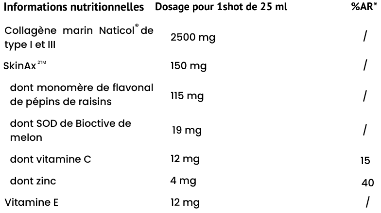 Eau osmosée, collagène marin Naticol® (peptides de collagène de type I et III) issu de poisson, acidifiant : acide citrique, acide phosphorique, arôme framboise, SkinAx2TM, arôme orange, conservateurs : sorbate de potassium, benzoate de sodium, vitamine E, sucralose, stévia.