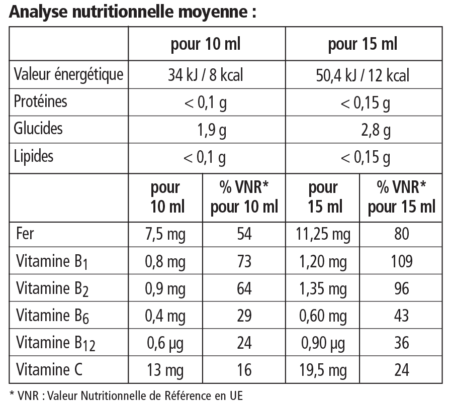 Extrait aqueux de plantes (54%) de : racine de carotte (Daucus carota), feuille d'ortie (Urtica dioica), feuille d'épinard (Spinacia oleracea), rhizome de chiendent (Agropyron repens), fruit de fenouil (Foeniculum vulgare), thalle d'algue brune (Macrocystis pyrifera), fleur d'hibiscus (Hibiscus sabdariffa) ; Mélange de jus de fruits concentrés (29,4%) de : poire, raisin, jus de cassis, eau, mûre, cerise, orange, betterave rouge, citron, extrait de caroube, pomme ; Extrait aqueux de levure, miel, extrait aqueux de cynorrhodon (Rosa canina) à 4% de vitamine C, fer (gluconate de fer), extrait de germe de blé, vitamine C (acide ascorbique), arômes naturels, vitamine B1 (chlorhydrate de thiamine), vitamine B2 (riboflavine phosphate sodique), vitamine B6 (chlorhydrate de pyridoxine), vitamine B12 (cyanocobalamine).